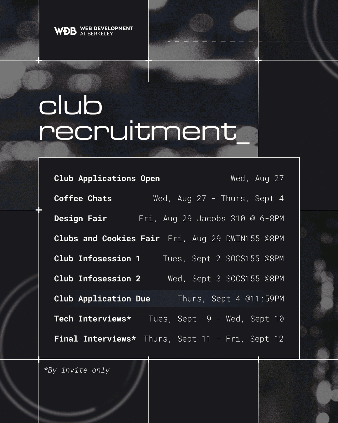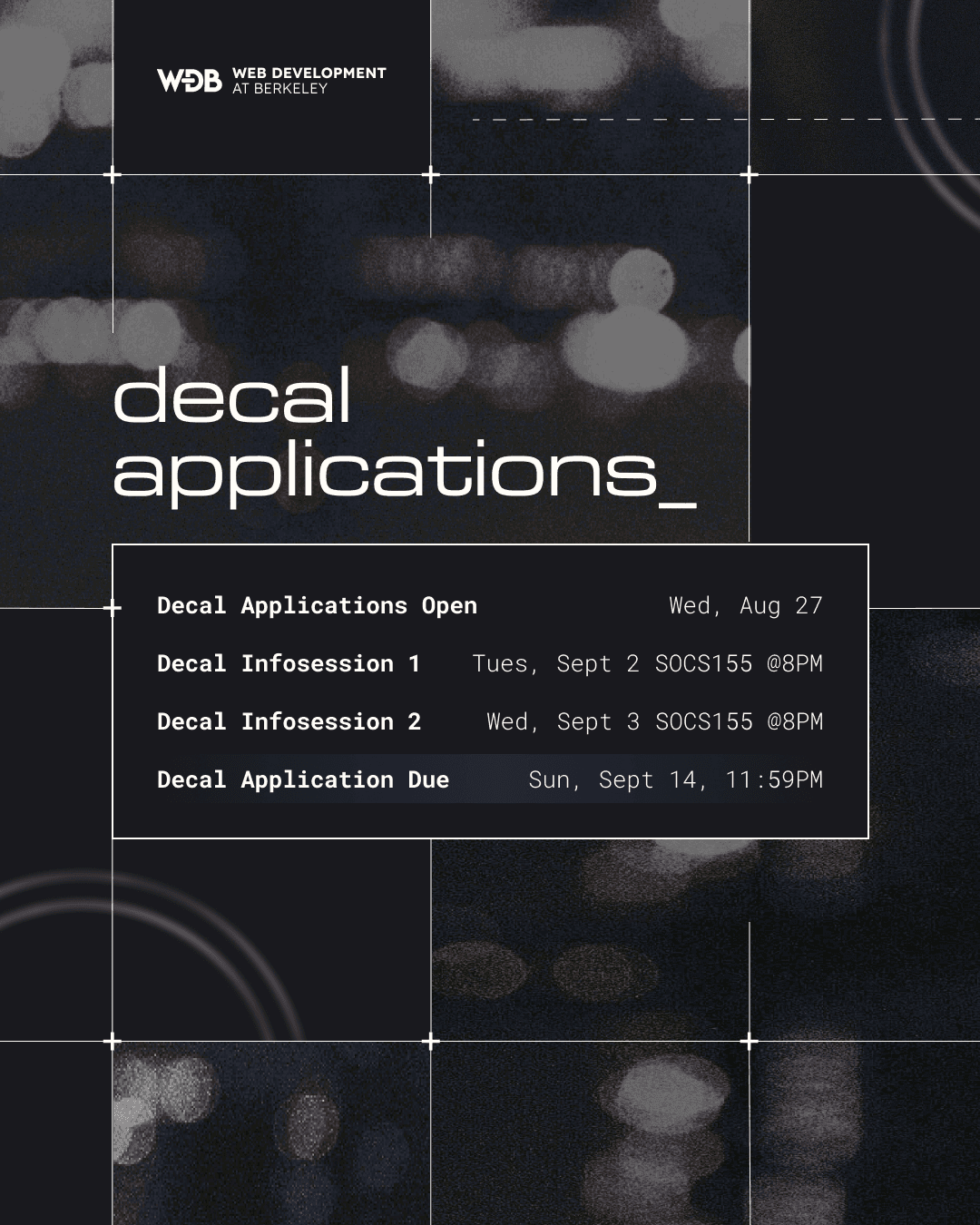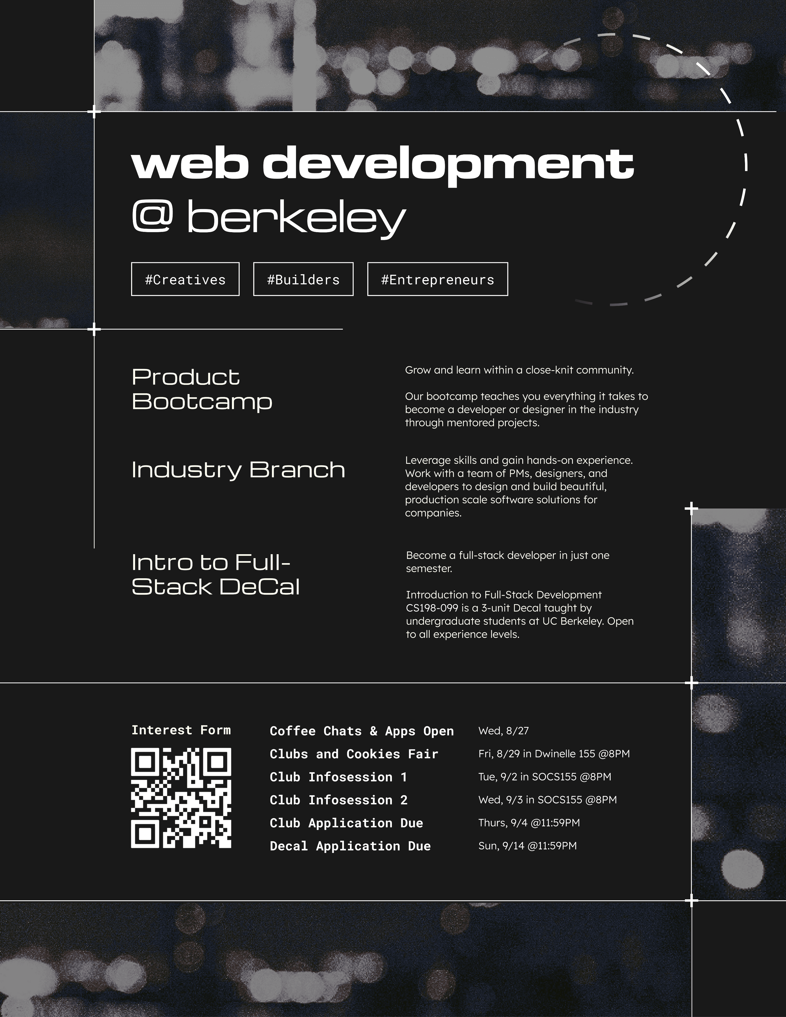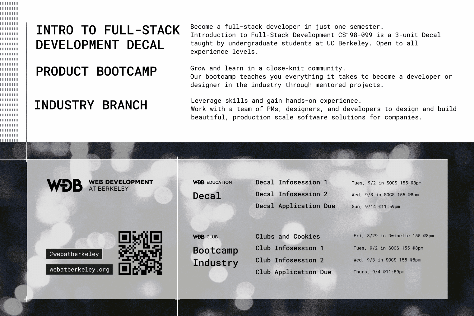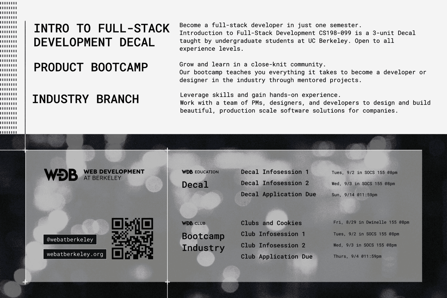 Web Development at Berkeley is UC Berkeley’s first web development and design-focused organization, offering students hands-on industry experience and full-stack web development education. Our mission is to empower passionate, motivated, and committed individuals to grow as developers, designers, and team players while fostering a vibrant, active community.